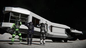 The Wayfarer-class Multirole Support Vessel is a small-grid, hydrogen-powered ship designed to serve a variety of functions, including prospecting, personnel transport, cargo hauling, reconnaissance and limited combat. Its most notable mission was during the first expedition to the Moon, where it ferried the engineers Caasicam, Bulik and Perp to the surface, where they would found Dudebase Alpha.
